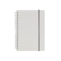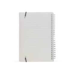 Caderno A5 com capa plástica e elástico para lacre, contém aproximadamente 80 folhas marfim com pauta.