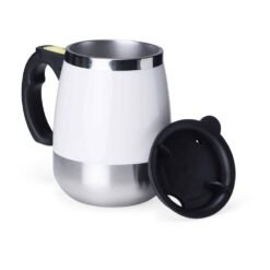 Caneca de inox com misturador de bebida, feita em parede dupla com capacidade de 350ml. Contém tampa plástica com bocal e trava de segurança. Para o funcionamento, utiliza-se duas pilhas AAA (não acompanha).