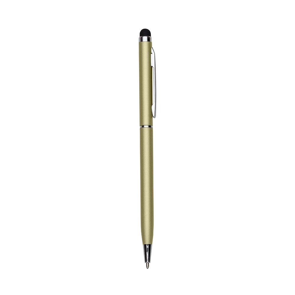 Caneta metálica com touch screen, carga esferográfica azul e acionamento por rotação.