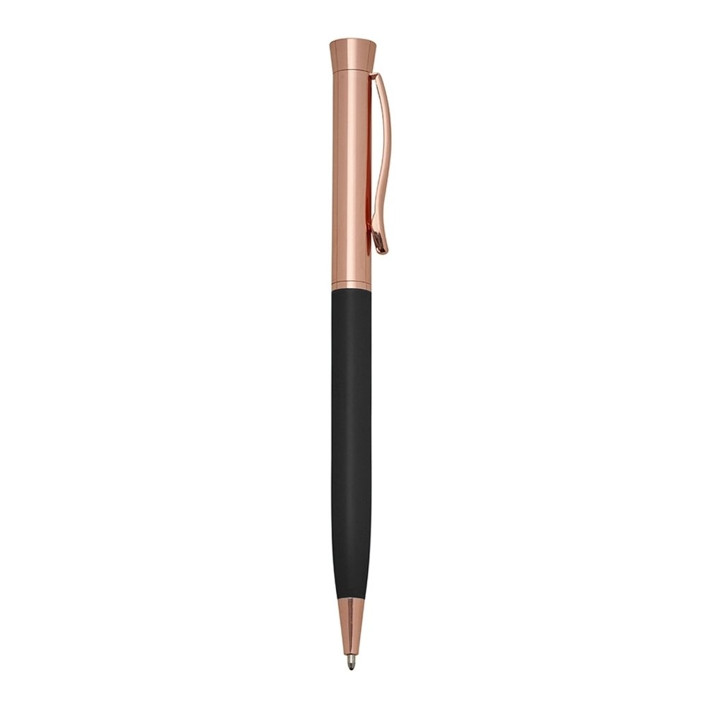 Caneta metálica com carga esferográfica azul e acionamento por rotação.