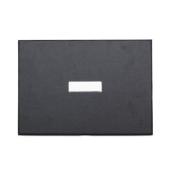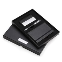 Kit executivo 3 peças em estojo de papelão com tampa e parte interna revestida de espuma. Contém: porta cartão de couro sintético texturizado com detalhes prata brilhante, caneta metal fosca com detalhe emborrachado preto, caderneta em couro sintético com aproximadamente 80 folhas amarelas pautadas. Acompanha placa metálica para gravação.