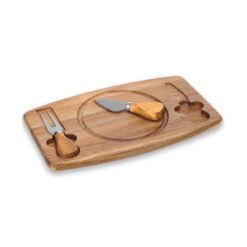 Kit queijo 3 peças, contém: tábua de madeira com canaleta, faca com ponta, e garfo. Tábua com imã para encaixe e fixação dos utensílios.