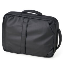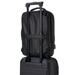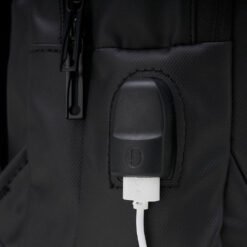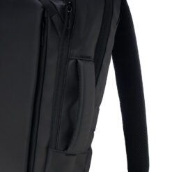 Mochila em couro sintético 17 litros resistente à água com cinco compartimentos, sendo o principal com bolso para notebook 156. Com divisórias internas para acessórios, a mochila possui suporte externo usb, alça para encaixe em malas de viagem e duas alças de mãos, sendo uma delas lateral para o transporte da mochila no modo pasta.
