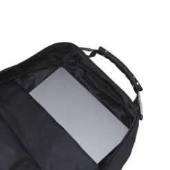 Mochila de nylon 30 litros com quatro compartimentos, sendo o principal com bolso para notebook 15,6. A mochila possui bolsos laterais em malha, duas alças de mãos e área costada com revestimento espumado.
