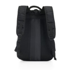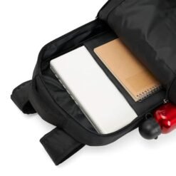 Mochila de poliéster 26 litros com três compartimentos, sendo o principal com bolso para notebook 156. A mochila possui bolsos laterais em malha, duas alças de mãos e área costada com revestimento espumado.